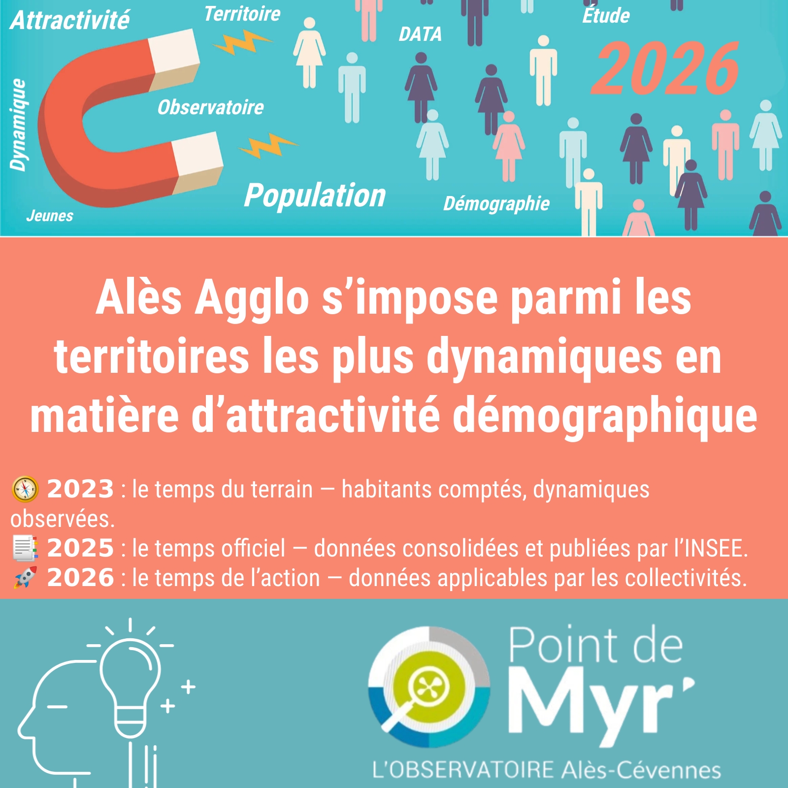 Avec 137 470 habitants, Alès Agglomération enregistre +8 313 habitants en six ans, soit une croissance de +1,05 %, largement supérieure à la moyenne nationale (+0,39 %). Cette dynamique place Alès comme la 2ᵉ ville moyenne la plus dynamique de France, avec près de 984 habitants supplémentaires en moyenne chaque année.