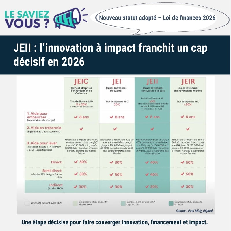 Le Projet de loi de finances pour 2026 marque une étape importante pour l’écosystème entrepreneurial français . Au-delà de la prorogation du statut Jeune Entreprise Innovante (JEI), l’Assemblée nationale a introduit une nouvelle catégorie : la Jeune Entreprise d’Innovation à Impact (JEII), une avancée structurelle pour valoriser l’innovation génératrice d’impact social et environnemental.
